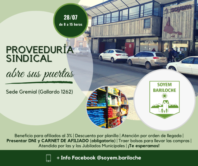 La Proveeduría Sindical ¡abre sus puertas el próximo 28 de julio! Es importante que recuerden traer bolsas para llevar sus compras, el DNI y carnet de afiliado. Lugar: Quincho de la Sede gremial (Gallardo 1262) Día: Viernes 28 de julio Horario: De 8 a 15 horas Requisitos Dirigido a las y los afiliados 3 %…