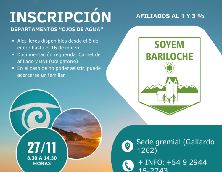 Compañeras y Compañeros, les informamos que se realizará la inscripción para el alquiler de los departamentos para que puedan disfrutar de sus vacaciones veraniegas en Las Grutas. Recuerden leer los requisitos y la metodología de inscripción antes de concurrir a realizar el trámite Inscripción Lugar: Sede gremial (Gallardo 1262) Día y horario: 27 de noviembre ~…