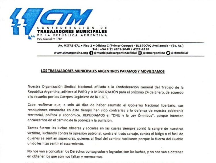 #24E: Comunicado de la Confederación de Trabajadores Municipales de la República Argentina
