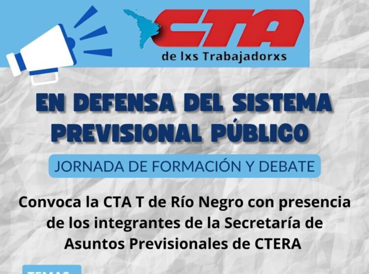 Te invitamos a participar de la Jornada de formación y debate “En defensa del sistema previsional público”!! La actividad convocada por la CTA T de Río Negro -central a la que pertenecemos- contará con la presencia de integrantes de la Secretaría de Asuntos Previsionales de CTERA Lugar: Salón de Usos Múltiples (SUM) “José Luis…