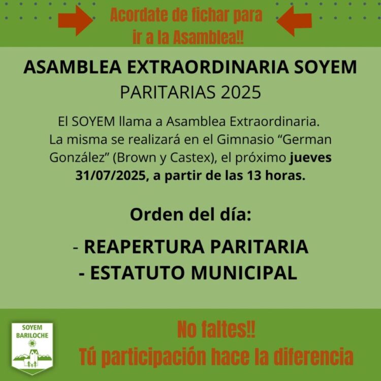 El Sindicato de Obreros y Empleados Municipales (SOYEM) de Bariloche presentó este martes 29 de julio dos notas formales dirigidas a la Intendencia municipal y a la Delegación de Trabajo Zona Andina, en las que solicita la reapertura del proceso paritario y convoca a una Asamblea General Extraordinaria de trabajadoras y trabajadores municipales. Paritaria para…