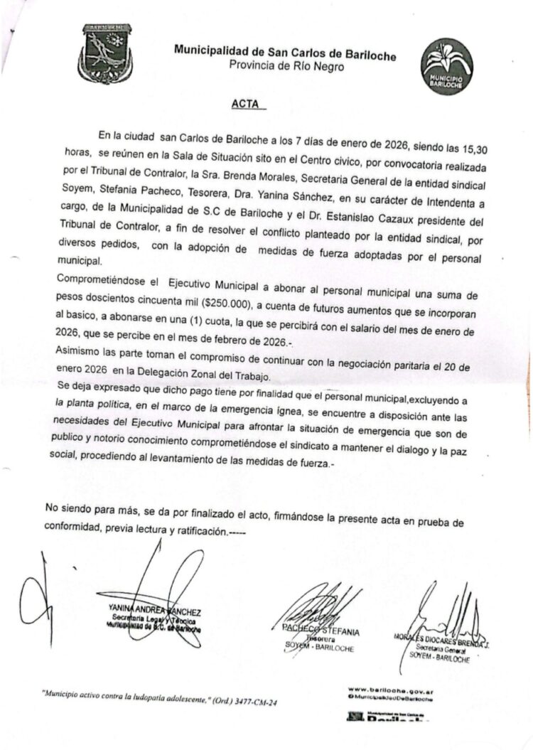 El Sindicato de Obreros y Empleados Municipales de Bariloche (SOYEM) informó a sus afiliados que en el día de la fecha tomó conocimiento de la Resolución N.° 41/2026, la cual presenta diferencias sustanciales respecto de lo acordado oportunamente en relación con la suma de 250.000 pesos. Según detallaron desde la conducción sindical, la mencionada resolución…