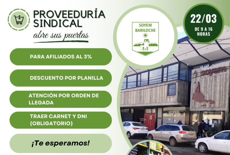 Este mes… la Proveeduría Sindical abre sus puertas el viernes 22/03! Te esperamos en el horario habitual de 9 a 16 horas. LUGAR: Quincho de la sede gremial (Gallardo 1262) DÍA: Viernes 22 de marzo HORARIO: De 9 a 16 horas DIRIGIDO A LAS Y LOS AFILIADOS 3 % Traé carnet y DNI (obligatorio) ¡No…