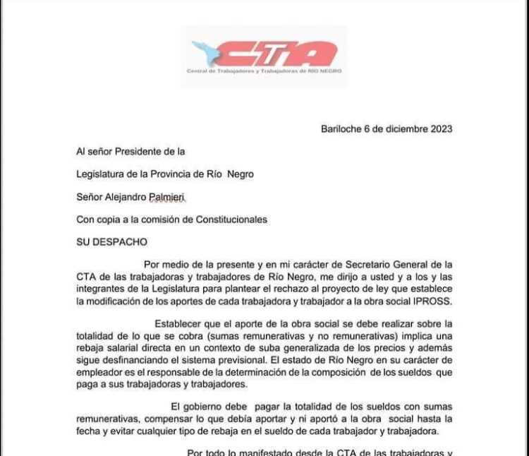 En nuestro carácter de amparistas, hemos solicitado a nuestra Central -CTA T Río Negro- que presente de forma urgente una nota dirigida al presidente de la Legislatura rionegrina, Alejandro Palmieri a los fines de expresar nuestro más profundo rechazo al proyecto de Ley que establece la modificación de los aportes de las y los trabajadores al…