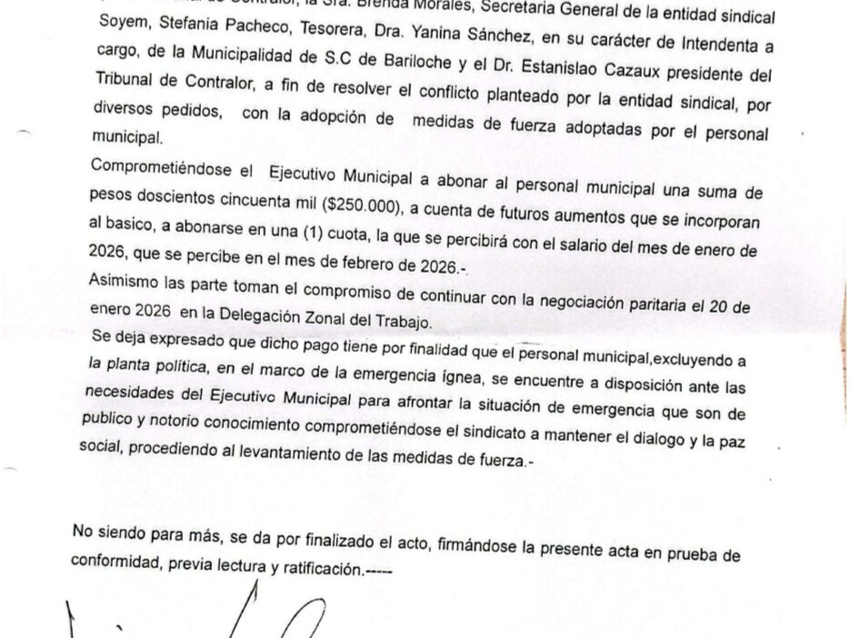 Desde el sindicato recordaron además que dicho acuerdo fue remitido con copia a la Delegación de Trabajo y que fue firmado por la intendenta interina Yanina Sánchez y por Stanislao Casaux, quien posteriormente confirmó públicamente el contenido del mismo a través de distintos medios de comunicación.