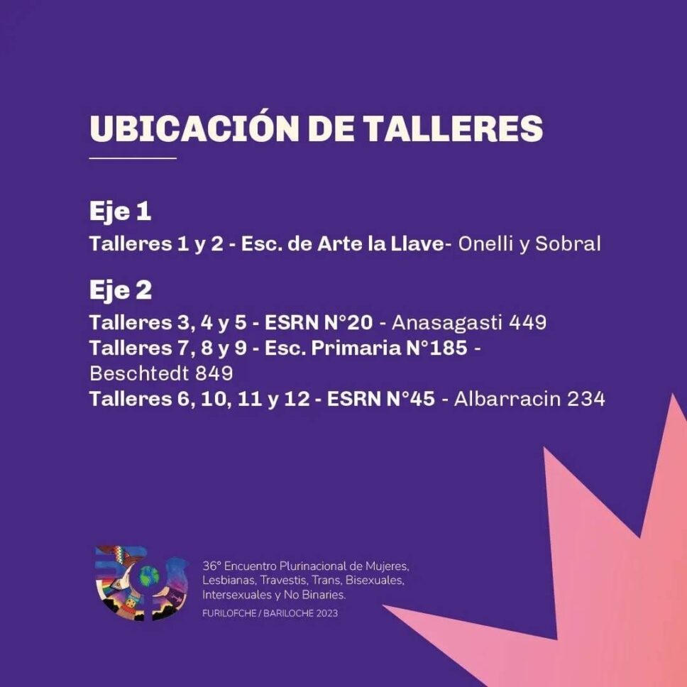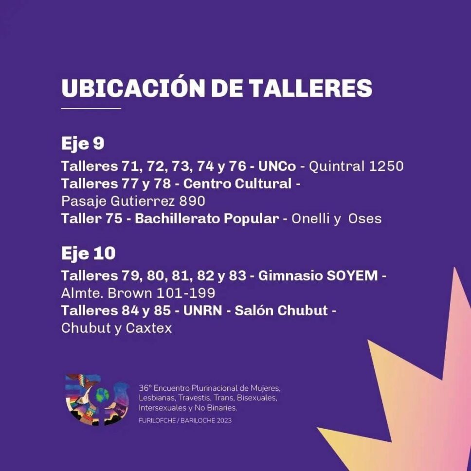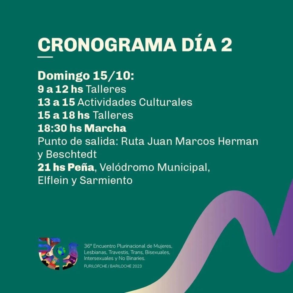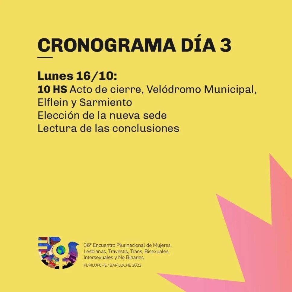 ¡Se viene el 36° Encuentro Plurinacional de Mujeres, Lesbianas, Travestis, Trans, Bisexuales, Intersexuales y No Binaries Bariloche Furilofche 2023! Compartimos el cronograma de las actividades que se desarrollarán en el marco de las tres jornadas.