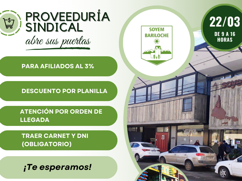 Este mes… la Proveeduría Sindical abre sus puertas el viernes 22/03! Te esperamos en el horario habitual de 9 a 16 horas.
